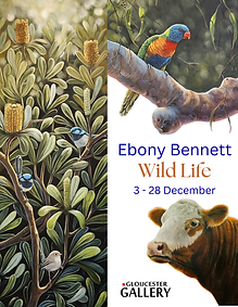 Wild Life is an exhibition that represents Ebony Bennett's love of nature and wildlife, be it Australian or from anywhere in the world. The exhibition showcases Australian birdlife and environments, but also exotic animal species such as Cows, Horses, Elephants and Lions.